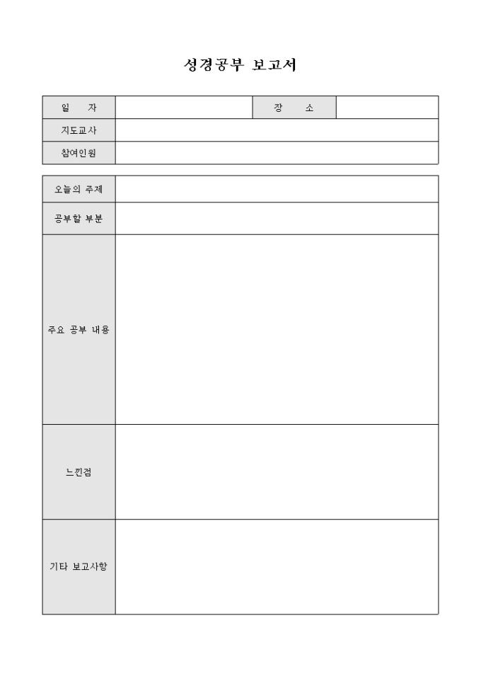 교회에서 성경공부를 실시하고 그 내용을 보고하기 위해 작성하는 성경공부 보고서 양식입니다. 공부한 일자 및 장소, 참여인원과 오늘의 주제, 공부할 부분, 주요 공부 내용 등의 항목으로 구성되어 있습니다.