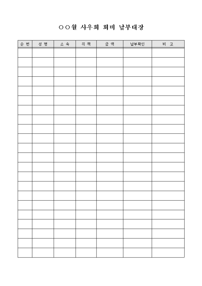 9,000원/월회사의 사우회에 납부하는 회비에 대하여 납부 금액 및 납부확인 여부를 기록하기 위한 사우회 회비 납부대장 양식입니다.