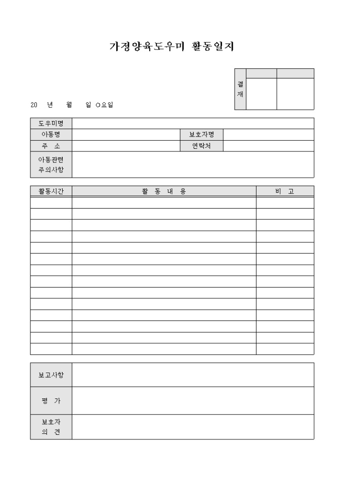 아이를 돌보기 어려운 가정에 대해 파견한 가정양육도우미의 활동내용을 기록하는 활동일지 양식입니다. 아동관련 주의사항 및 시간별 활동내용, 보고사항, 평가, 보호자 의견 등의 항목을 기재할 수 있습니다.