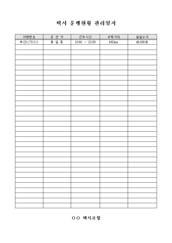9,000원/월택시조합에 소속된 택시들의 일일 운행현황을 관리하고자 할 때 사용할 수 있도록 만들어졌으며 운행거리 및 일일 수익을 기입할 수 있게끔 제작된 서식입니다.