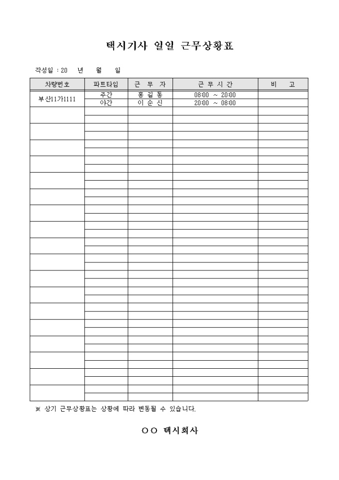 택시기사 일일 근무상황표