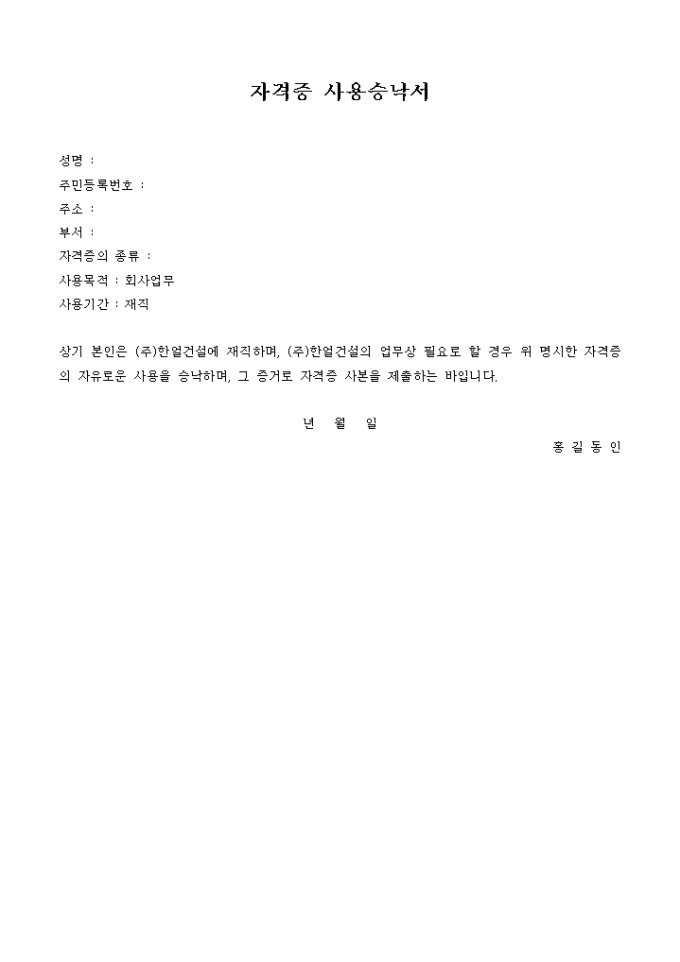 개인이 해당회사에 재직하며, 회사가 업무상 필요로 할 경우 명시한 자격증의 자유로운 사용을 승낙하는 양식으로 자격증 사본을 제출하여야 합니다.