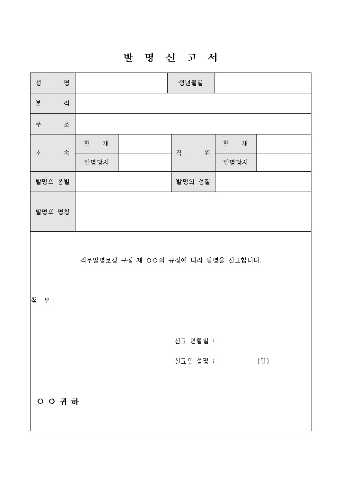 회사에서 발명 해 직무발명 보상규정에 따라 발명을 신고하고자 할 때 사용하는 서식으로 발명자의 인적사항과 소속 및 직위, 발명의 성질 등을 기록합니다.