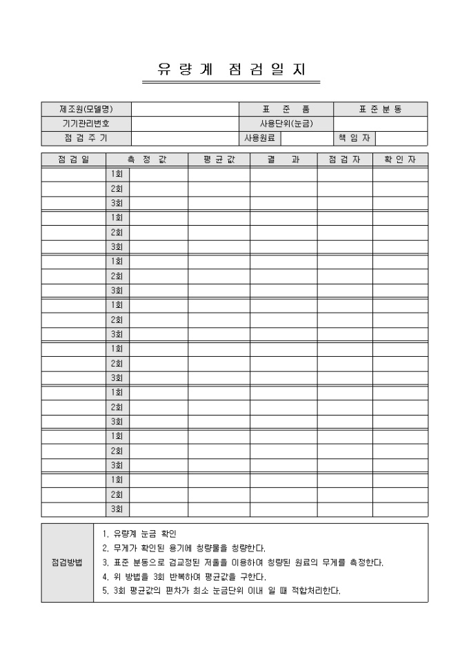유량계 점검시 사용할 수 있는 유량계 점검일지입니다. 제조원, 기기관리번호, 점검주기, 점검일 등의 항목으로 구성되어있습니다.