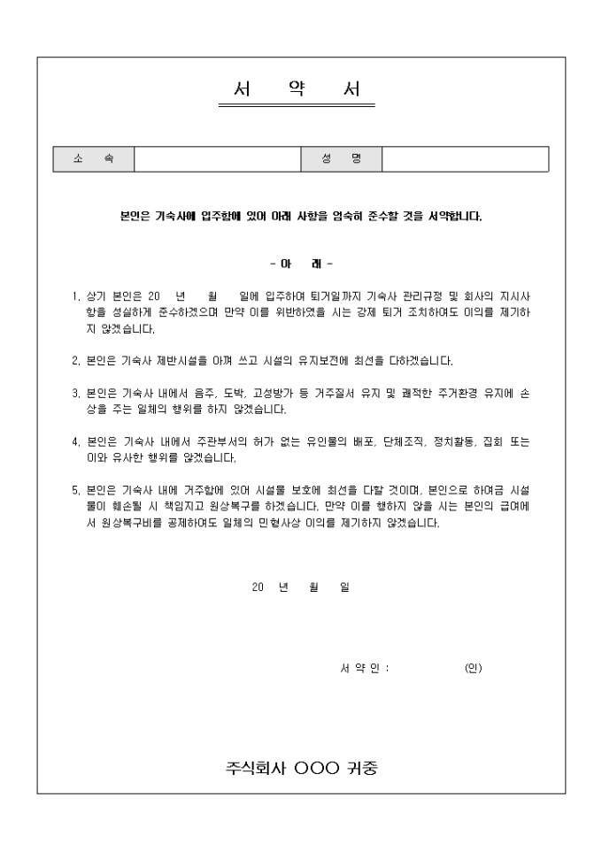9,000원/월기숙사 입주 시 지켜할 사항을 기록/ 서약하는 기숙사 입주 서약서입니다. 5개 조항으로 구성되어있습니다.
