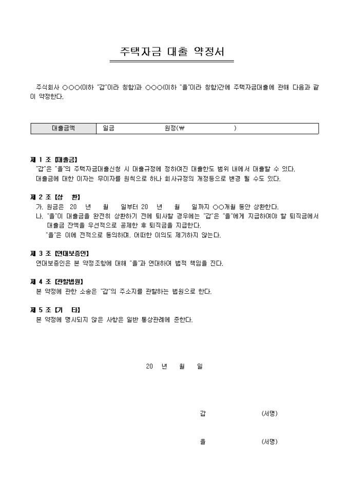 주택자금 대출에 관한 사항을 약정할 때 사용하는 주택자금 대출 약정서입니다. 대출금, 상환, 연대보증인 등 5개 조항으로 구성되어있습니다.