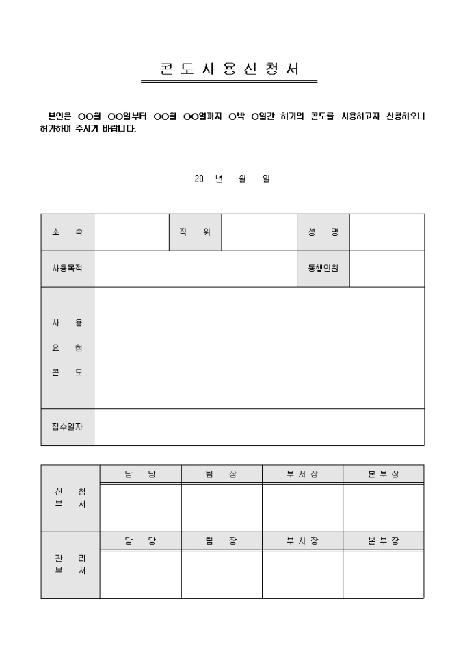 회사 콘도 사용을 신청할 때 사용하는 콘도사용신청서입니다. 소속, 직위, 성명, 사용목적, 사용요청콘도 등의 항목으로 구성되어있습니다.
