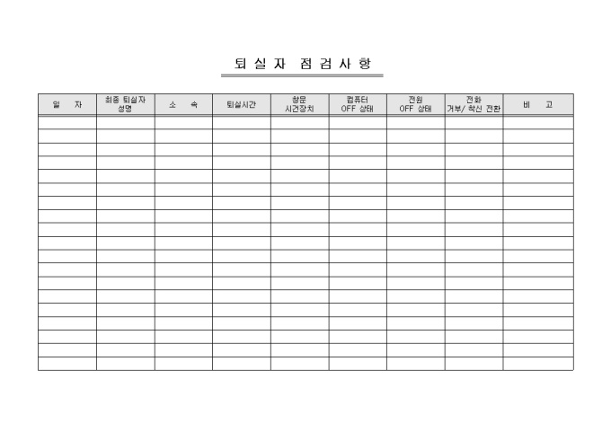 퇴실자가 점검해야 할 부분을 기록/ 관리할 수 있는 퇴실자 점검사항표입니다. 일자, 최종 퇴실자 성명, 소속, 퇴실시간 등의 항목으로 구성되어있습니다.