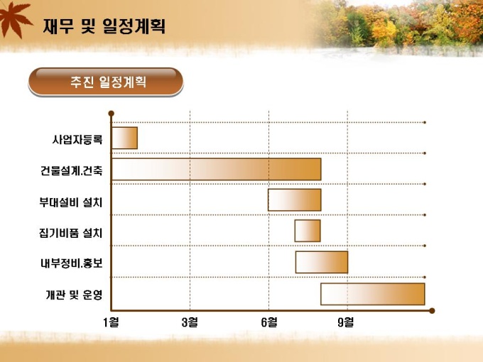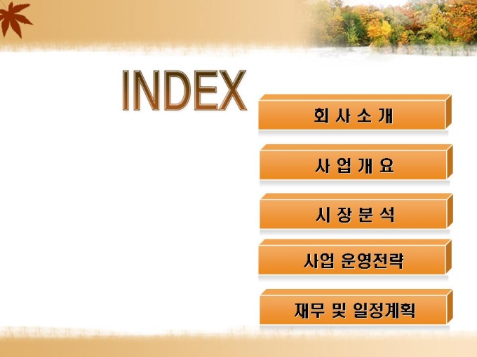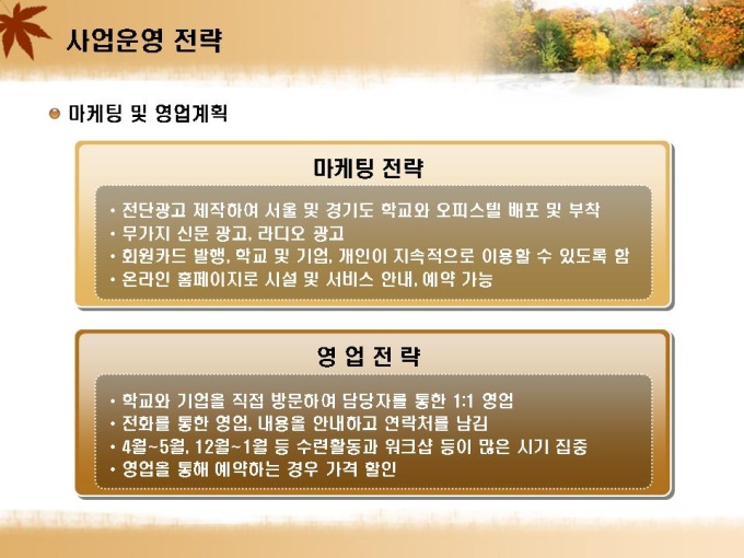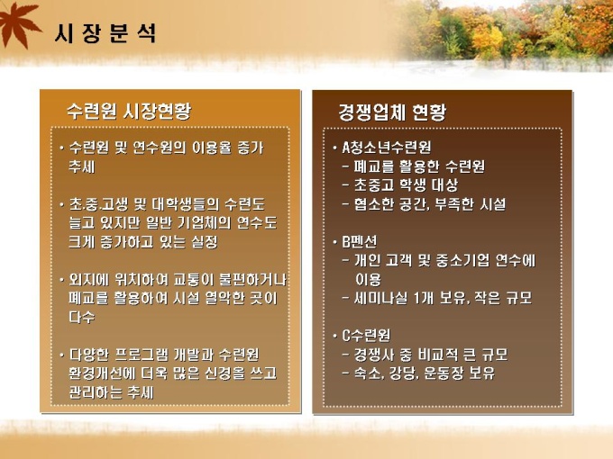 수련원 및 연수원 설립 사업계획서입니다. 목차는 1.회사소개 2.사업개요 3.시장분석 4.사업 운영전략 5.재무 및 일정계획으로 구성되어있습니다.