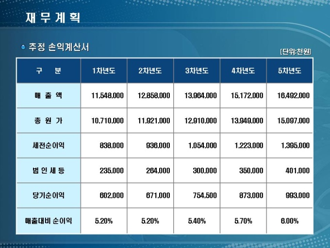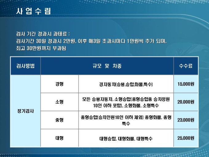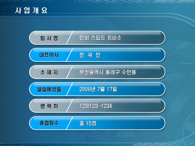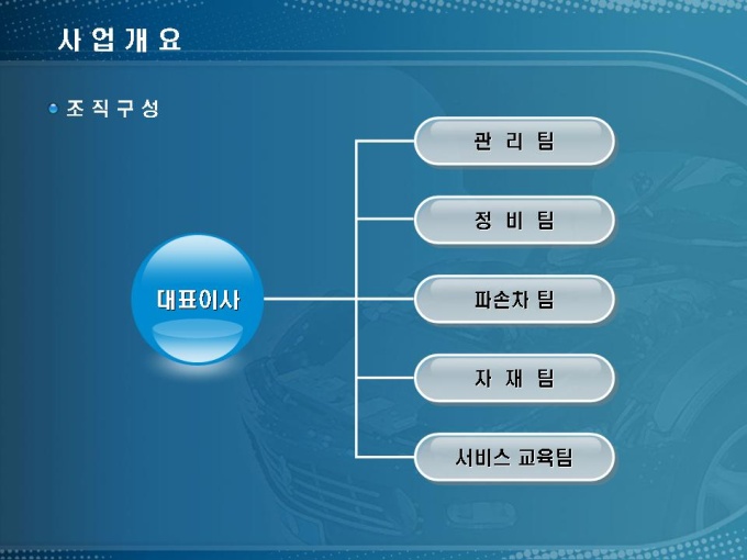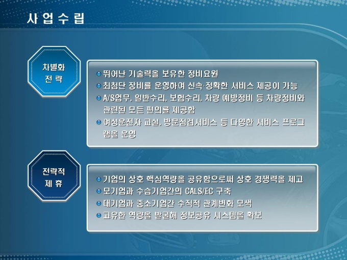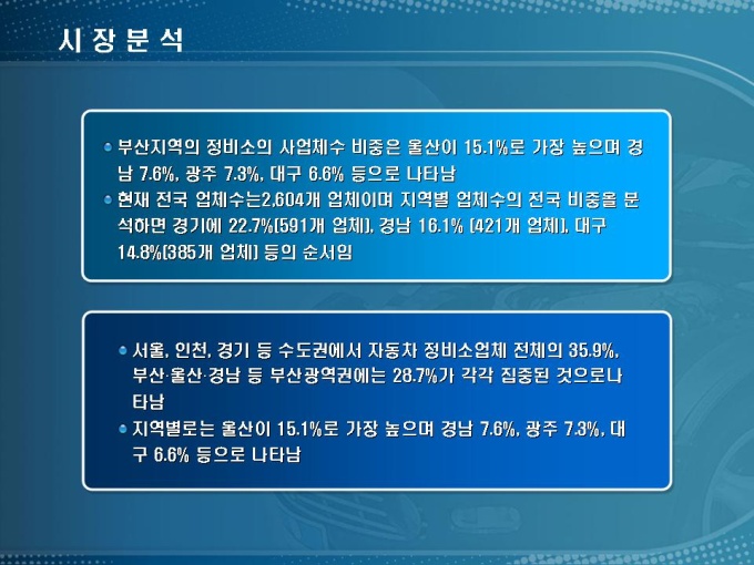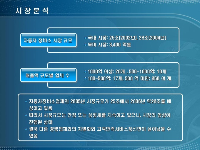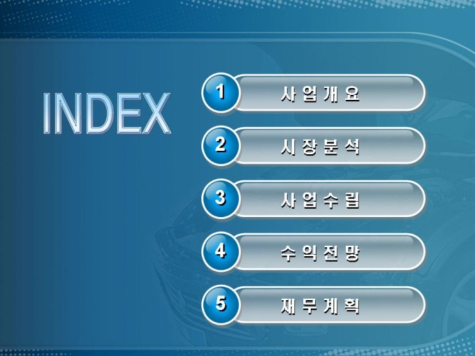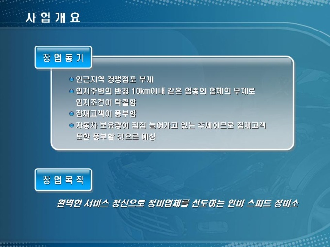 자동차 정비소 창업사업계획서입니다. 목차는 1.사업개요 2.시장분석 3.사업수립 4.수익전망 5.재무계획으로 구성되어 있습니다.