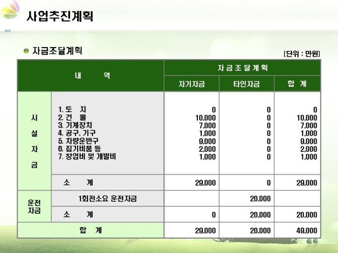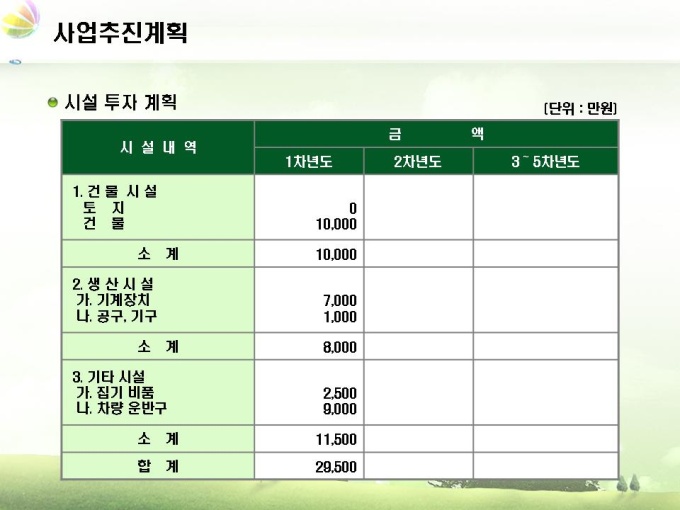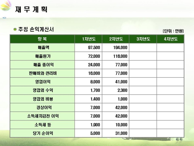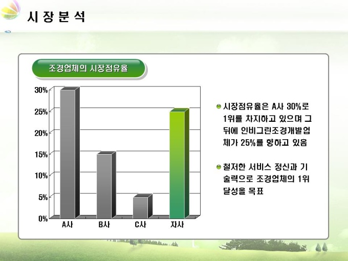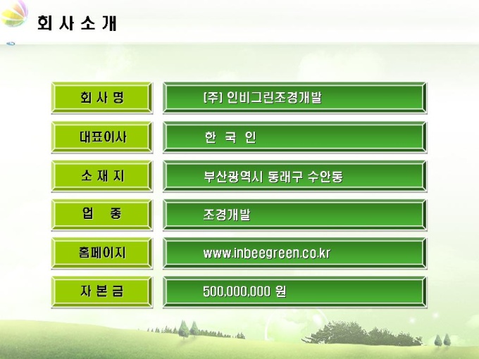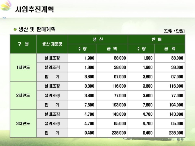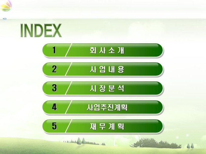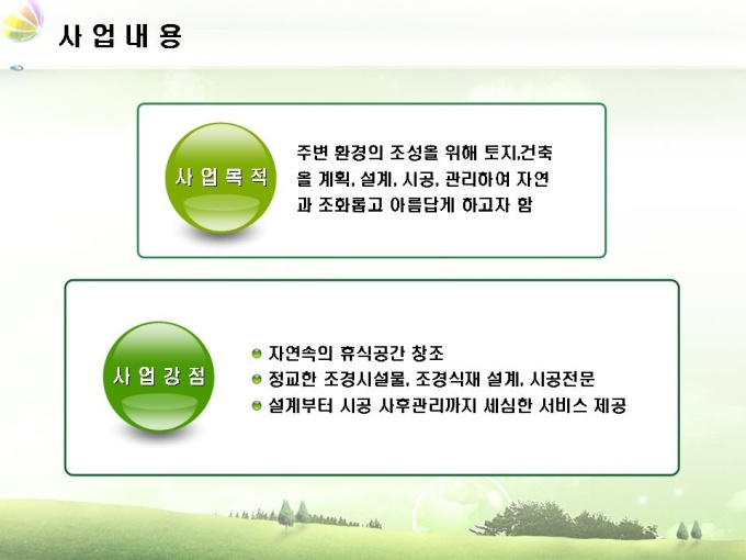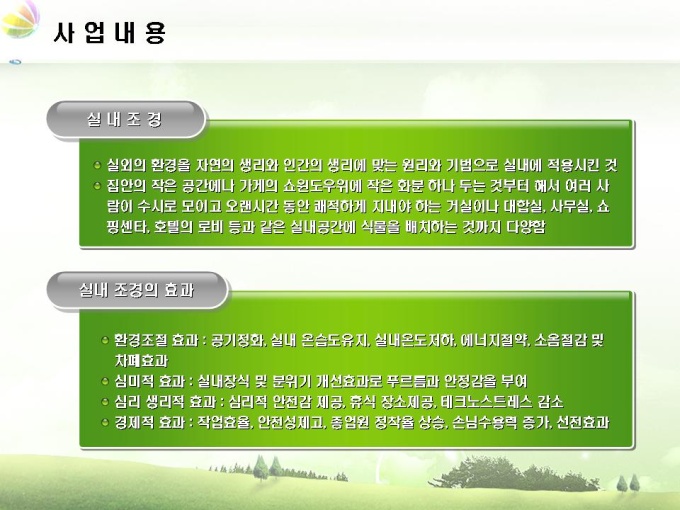 조경업체 사업계획서입니다. 목차는 1.회사소개 2.사업내용 3.시장분석 4.사업추진계획 5.재무계획으로 구성되어 있습니다.
