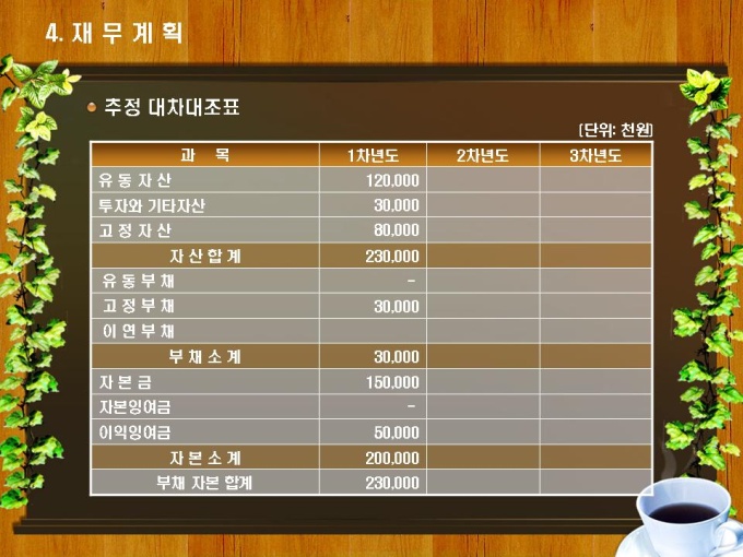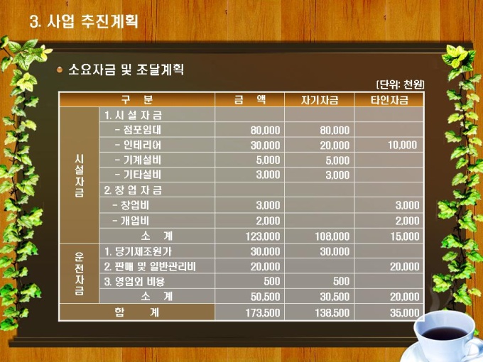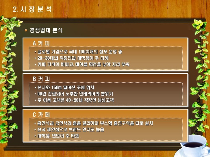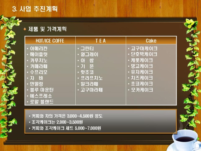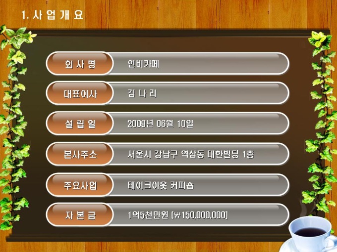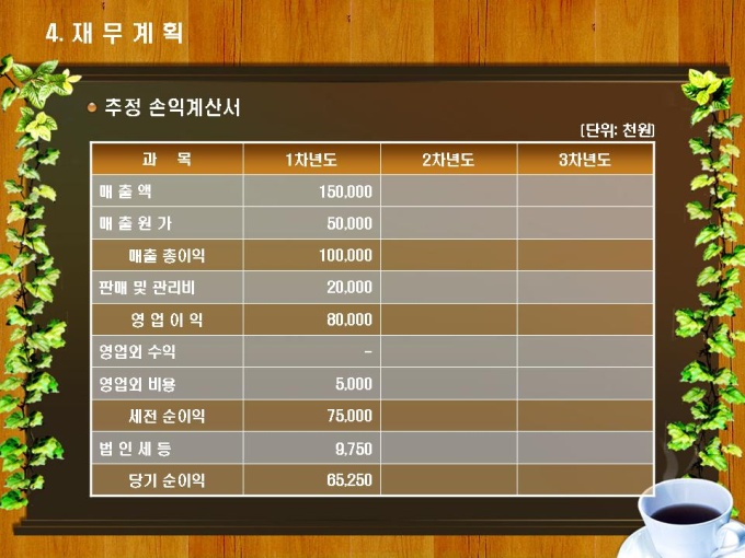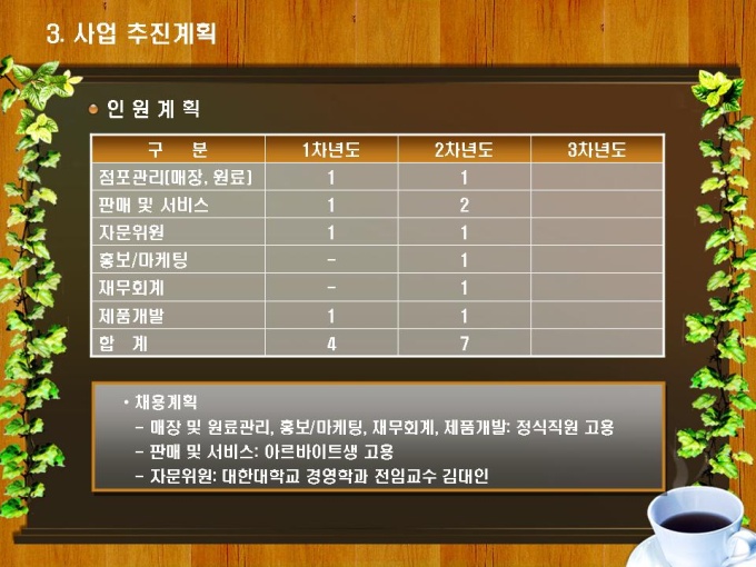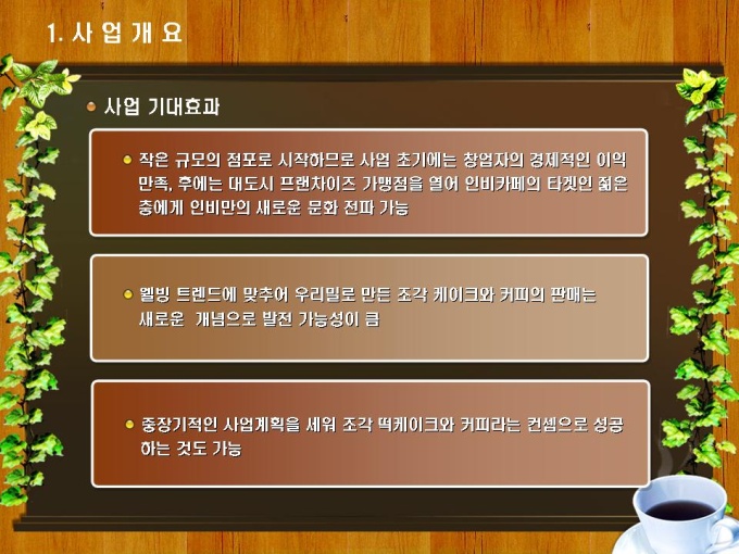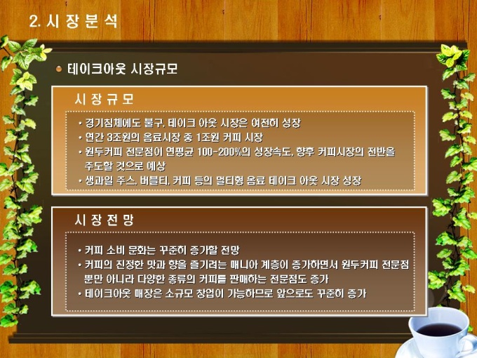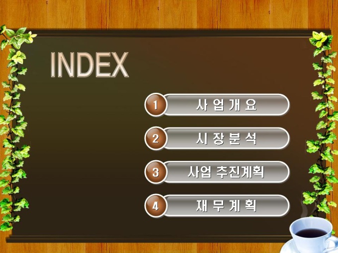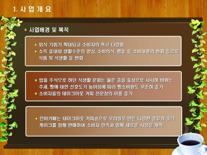 테이크아웃 커피숍 사업계획서입니다. 목차는 1.사업개요 2.시장분석 3.사업 추진계획 4.재무계획으로 구성되어있습니다.