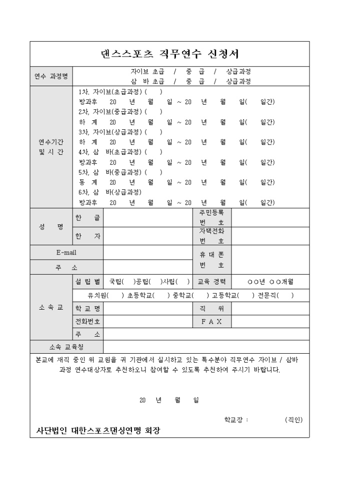 교원들을 대상으로 실시하고 있는 직무연수 자이브 / 삼바 과정 연수대상자로 추천시 사용하는 직무 연수 신청서 입니다.