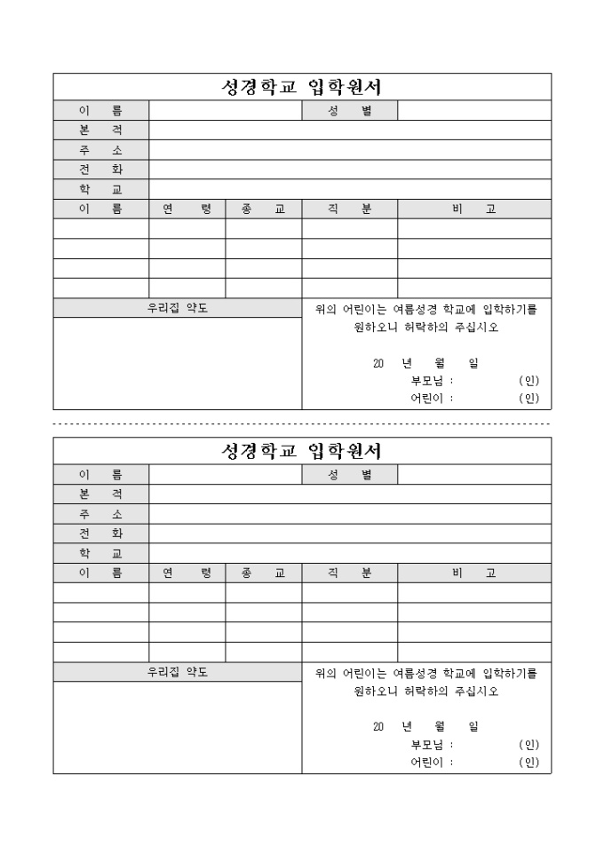 방학동안 실시하는 여름성경학교 입학원서 입니다. 2부로 나누어 사용이 가능합니다.
