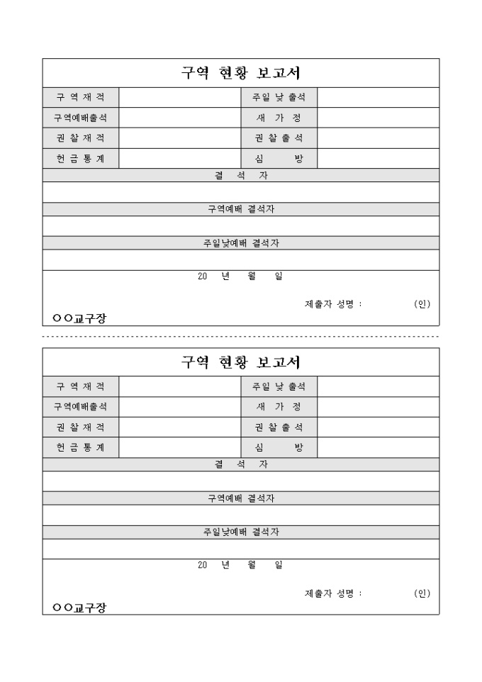 교회에서 사용하는 구역현황 보고서 입니다. 교회 예배 참석자를 교구별로 파악하여 기록시 사용합니다.