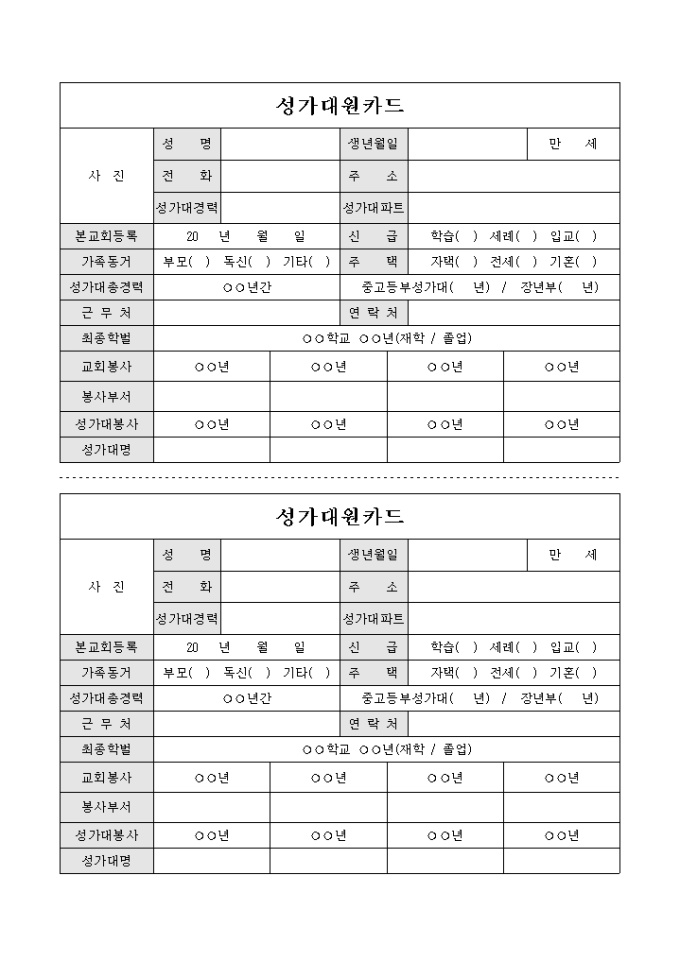 2부로 나누어 사용이 가능한 성가대원 카드입니다. 성가대원의 정보를 기록 할 수 있습니다.