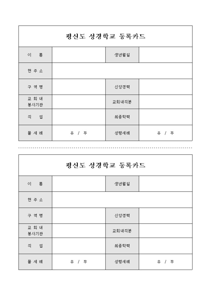 9,000원/월2부로 나누어 사용이 가능한 평신도 성경학교 등록카드 입니다.