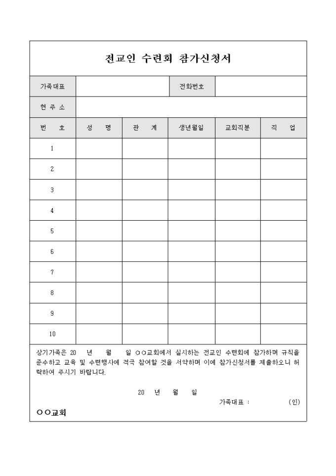 9,000원/월전교인이 실시하는 수련회에 참가시를 희망시 사용하는 참가 신청서 입니다.
