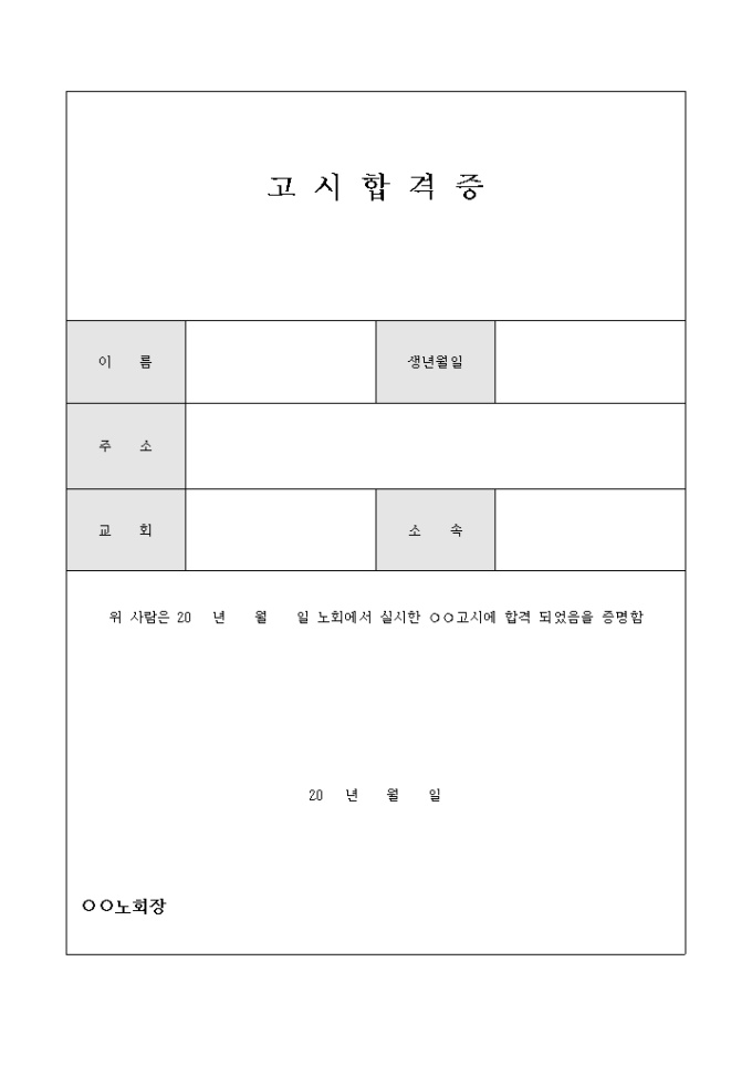 9,000원/월노회에서 실시한 고시에 합격 되었음을 증명시 사용하는 고시 합격증 입니다.