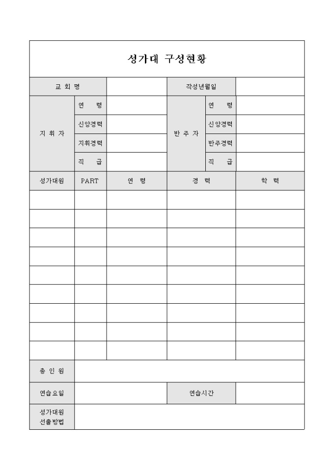 성가대 구성현황을 한눈에 확인 할 수 있도록 구성되어 있습니다. 지휘자 및 반주자의 약력과 성가대원의 정보를 기록 할 수 있습니다.