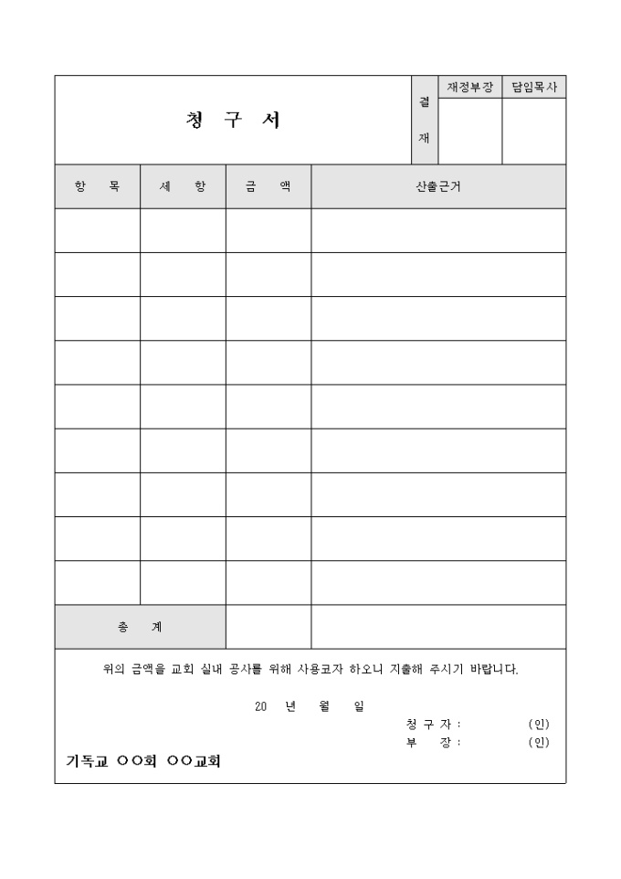 교회 실내공사에 사용될 금액들을 청구시 사용하는 청구서 입니다.