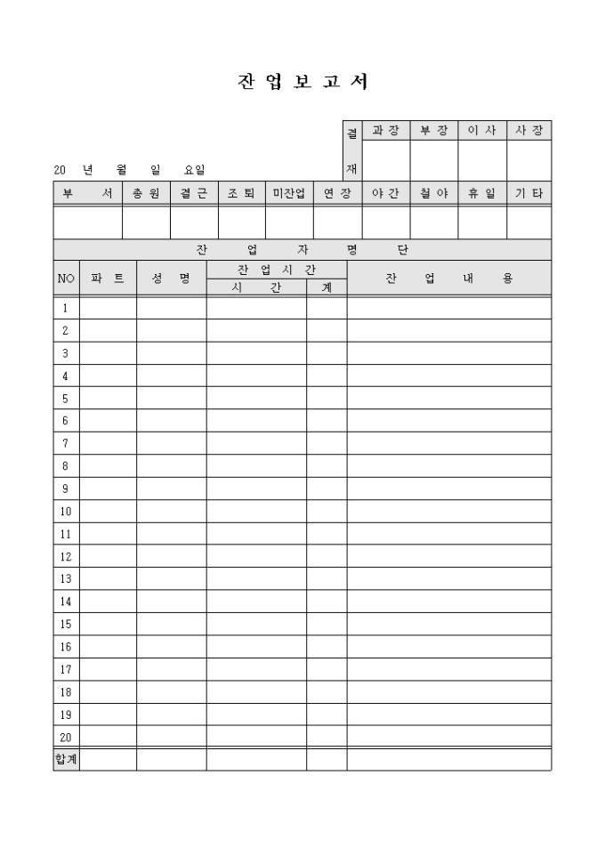 9,000원/월근무시간외에 잔업을 해야될 때에 잔업을 수행하고 잔업내용을 보고하기 위한 잔업보고서 양식입니다. 해당부서의 인원현황과 잔업자 명단을 기재할 수 있도록 구성되어 있습니다.
