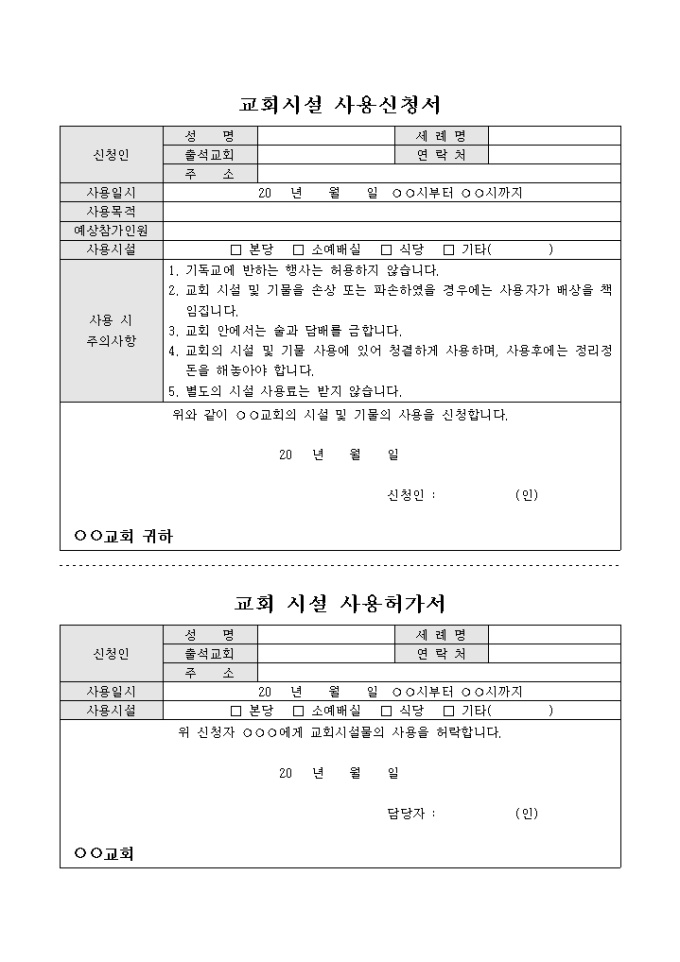9,000원/월교회의 시설 및 기물을 사용하기 위해 작성하는 사용신청서 및 사용허가서 양식입니다.