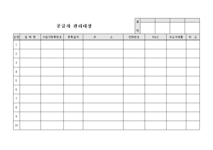 업체에서 물품을 납품하는 업체와 관련사항을 효율적으로 관리하고자 할 때 사용할 수 있도록 만들어졌으며 업체명, 연락처 및 주소, 주요거래품 등을 기입할 수 있게끔 제작된 서식입니다.