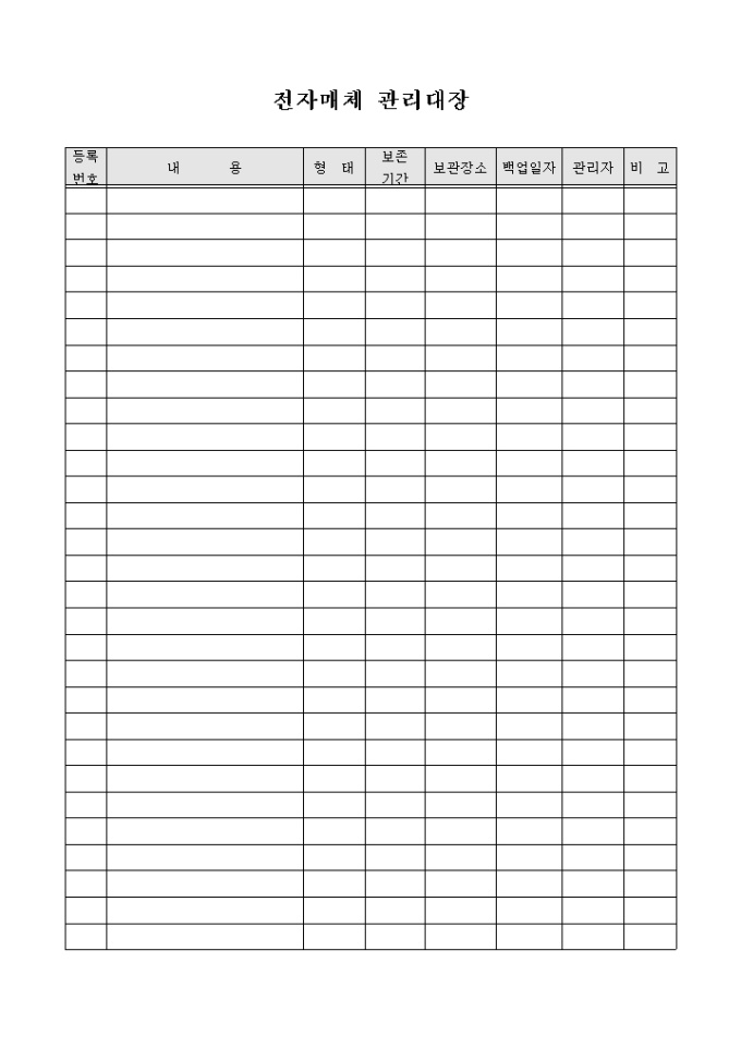 9,000원/월업체에서 사용, 보관하는 전자매체 기록 등의 관리를 효율적으로 하고자 할 때 사용할 수 있도록 만들어졌으며 내용 및 형태, 백업 등의 항목을 기입할 수 있게끔 제작된 서식입니다.