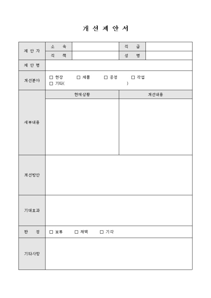 업체에서 근무하는 직원이 업무를 수행하면서 보다 나은 근무환경 등 업체를 발전시킬 수 있는 개선사항을 발견하였을 경우 이에 대하여 기재하여 제출할 수 있게끔 제작된 서식입니다.