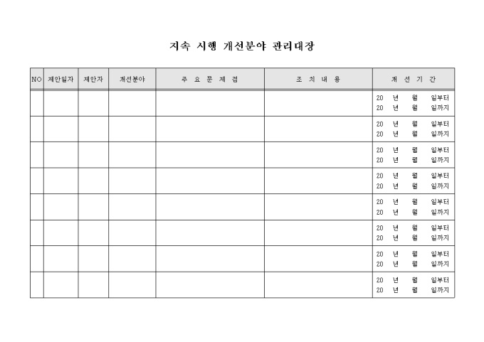 9,000원/월업체에서 제안된 개선사항 중 지속적으로 시행해야 하는 부분을 효율적으로 관리하고자 할 때 사용할 수 있도록 만들어졌으며 제안분야 및 문제점, 개선내용, 기간 등을 기입할 수 있게끔 제작된 서식입니다.