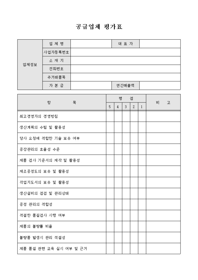 9,000원/월업체와 거래를 하고 있는 공급업체에 대하여 평가를 실시하여 거래 지속여부 및 당사 생산계획에 차질 여부 등을 판단할 수 있게끔 제작된 서식입니다.
