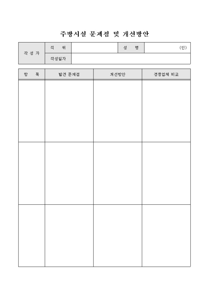 9,000원/월조리 업무에 근무하는 직원이 주방시설이나 기타 조리 업무에 관하여 문제점을 발견하면 개선내용 및 경쟁업체의 현재 적용 방법 등을 기입할 수 있게끔 제작된 서식입니다.