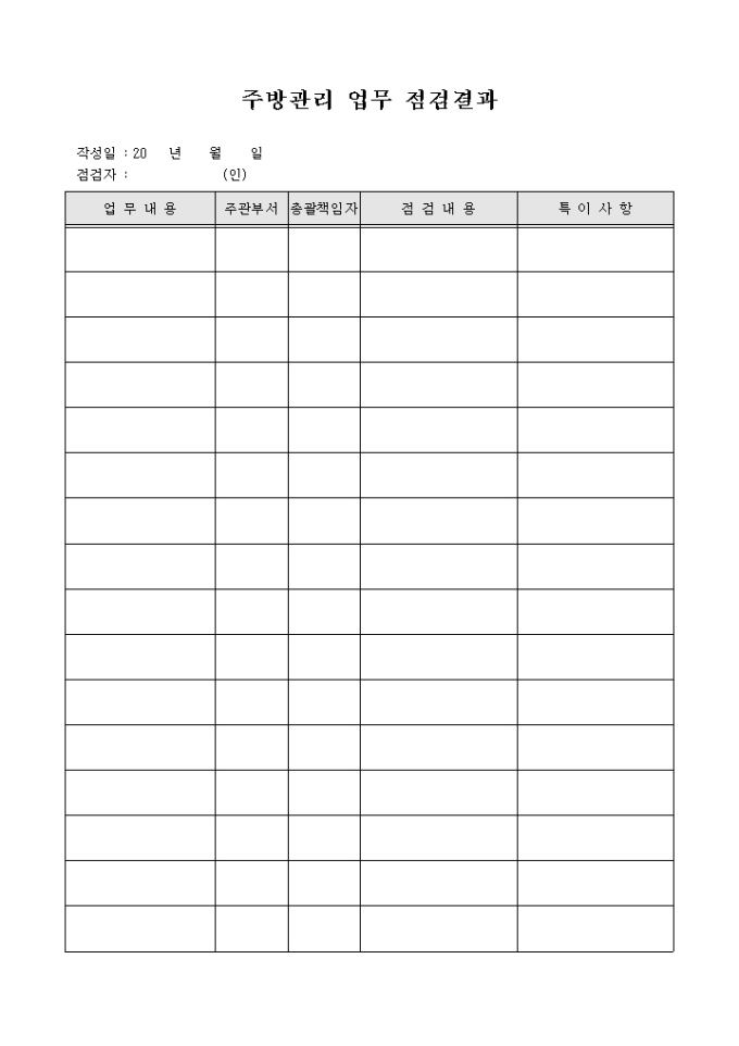 조리 업무, 주방관리 업무와 관련하여 업무에 대한 내용을 점검하고 그 내용 및 특이사항을 기록할 수 있게끔 제작된 서식입니다.