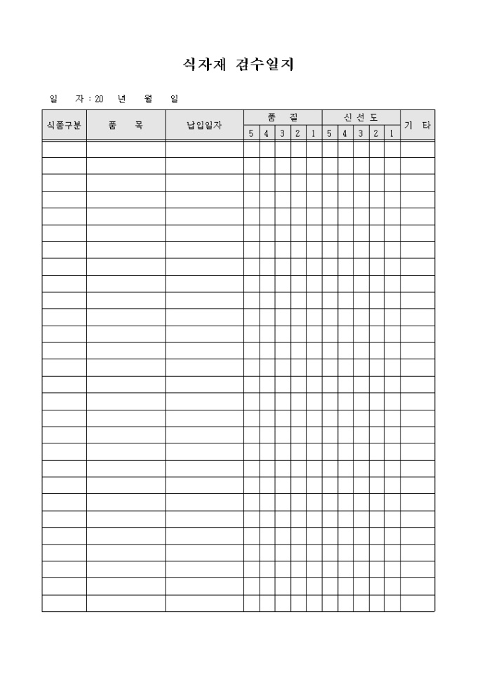 조리부서에서 관리하는 식자재에 대하여 검수를 실시하고 그 결과를 기입할 수 있도록 만들어졌으며 품질, 신선도 항목에 대한 평가를 할 수 있게끔 제작된 서식입니다.