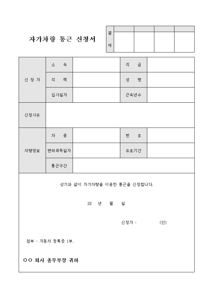 9,000원/월회사에 통근을 하는데 있어서 자가차량을 이용하여 통근함을 신청하고자 할 때 사용할 수 있도록 만들어졌으며 신청자 인적사항 및 통근구간, 차량정보 등을 기입할 수 있게끔 제작된 서식입니다.