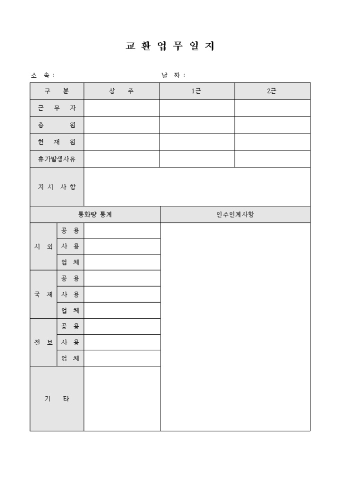 9,000원/월연락 교환 업무자의 업무 일지로 근무형태에 따른 근무자의 상황과 통화량 통계 및 인수인계사항 등의 항목으로 구성되어 있습니다.