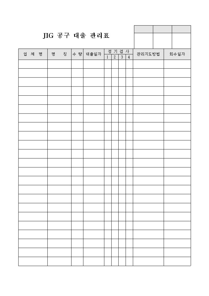 9,000원/월JIG 공구 대출 내역에 대해서 편리하게 관리 할 수 있도록 제작된 서식으로 업체명과 명칭 및 대출일자, 관리지도 방법 등의 항목을 기록합니다.