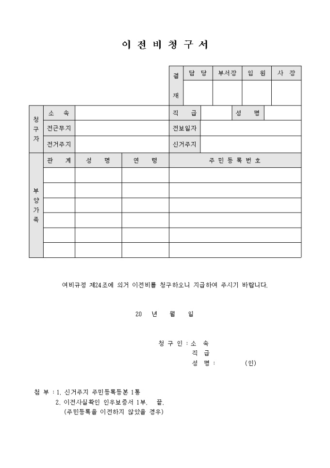 이전비를 청구하고자 할 때 사용하는 서식으로 청구자의 소속 및 전거지주와 신거주지의 주소를 작성하고 부양가족의 기본적인 인적사항을 기록합니다.