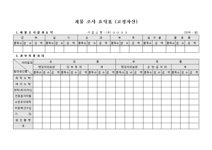 고정자산인 재물에 대한 조사 내용을 기록할 수 있도록 제작된 서식으로 재물조사 결과에 대해서 요약하고 과부족품 처리 내역을 기록합니다.