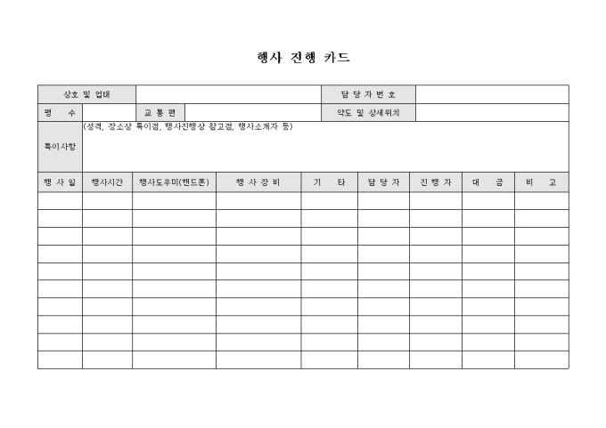 9,000원/월행사를 진행하고자 할 때 내용에 대해서 상세히 기록할 수 있는 서식으로 교통편과 약도, 업체의 정보 등을 기재하고 특이사항 및 행사의 상세 정보를 기록합니다.