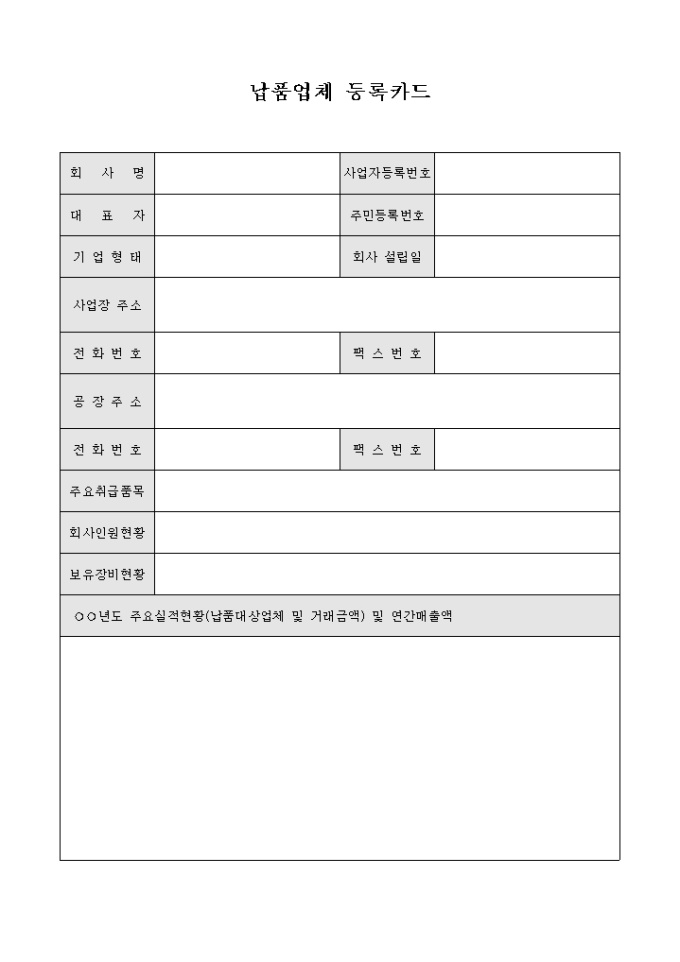 납품업체 관리를 편리하게 할 수 있도록 제작된 서식으로 등록된 납품업체의 정보와 실적 및 연간 매출액등을 기록합니다.