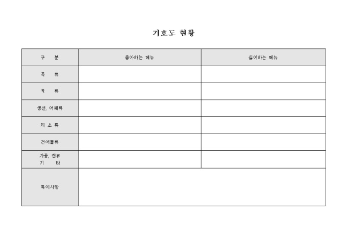 식당 고객의 기호도를 조사하여 기록 할 수 있도록 제작된 서식으로 음식 분류별 좋아하는 음식과 싫어하는 음식으로 구분하여 기록합니다.