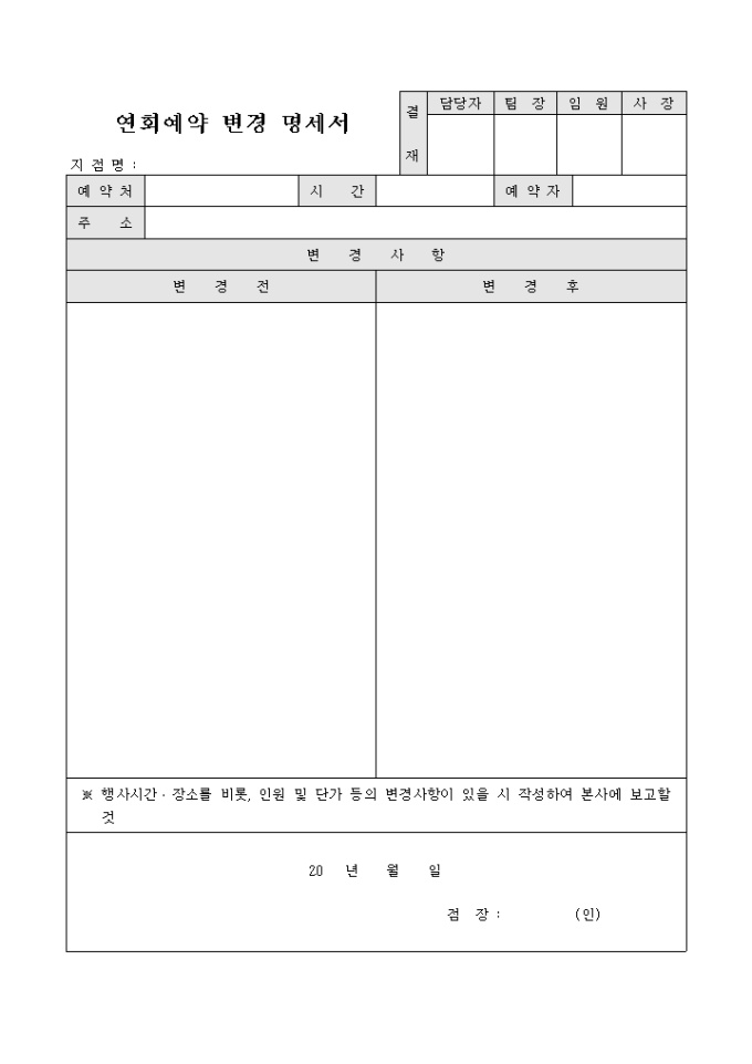9,000원/월연회 예약후 예약 내용을 변경 한 내역에 대해서 기록할 수 있도록 제작된 서식으로 변경전, 후의 내용을 기록합니다.