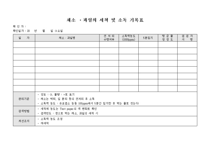 9,000원/월채소, 과일의 세척 및 소독 내역을 효율적으로 기록 할 수 있도록 제작된 서식으로 품명과 전처리 수행여부 및 헹금물 청정도 등의 항목을 기록합니다.