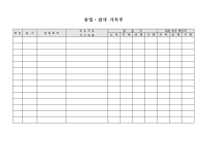 출입, 검사 내역에 대해서 기록할 수 있도록 제작된 서식으로 점검목적 및 지시내용과 점검자의 성명을 기록합니다.