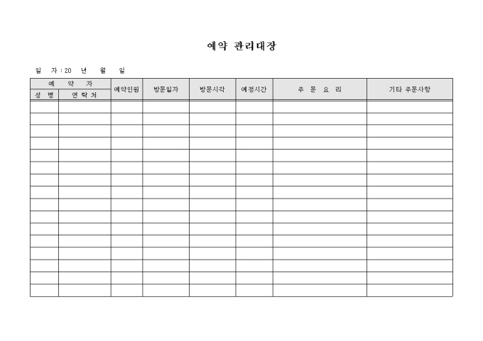 9,000원/월식당을 운영함에 있어서 고객이 예약을 희망하여 이를 신청할 경우 예약 현황을 정리, 관리하고자 할 때 사용할 수 있도록 제작된 서식입니다.