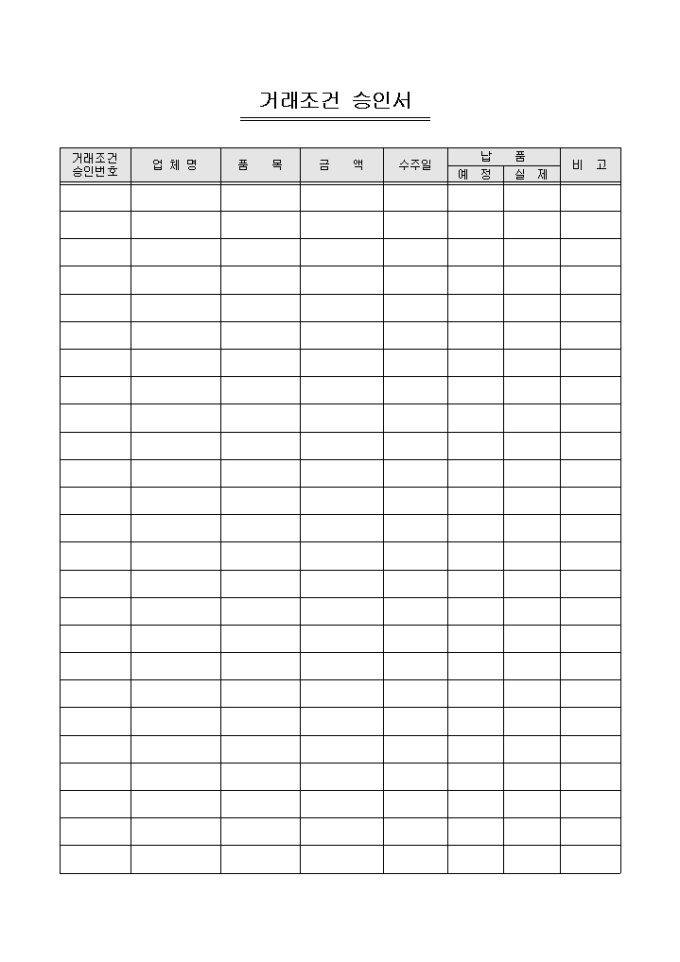 거래처별로 거래조건 승인 내역을 기록/ 관리할 수 있는 거래조건 승인서입니다. 거래조건 승인번호, 업체명, 품목, 금액 등의 항목으로 구성되어있습니다.