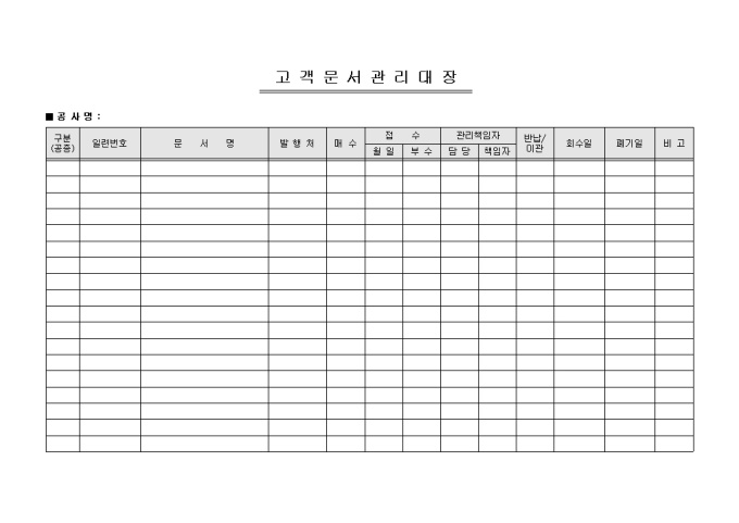 9,000원/월고객 문서에 대한 현황을 기록/ 관리할 수 있는 고객문서관리대장입니다. 구분, 일련번호, 문서명 등의 항목으로 구성되어있습니다.