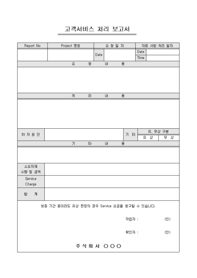 9,000원/월고객서비스 처리 현황을 기록/ 보고할 때 사용하는 고객서비스 처리 보고서입니다. Report No, Project 명칭, 요청일자, 요청내용 등의 항목으로 구성되어있습니다.